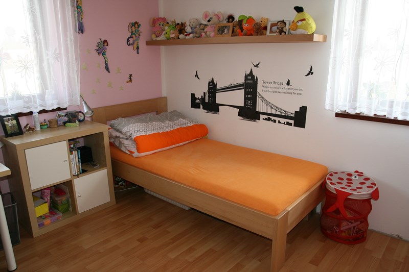 Postel z masivu - Orlová, tato postel je vyrobena z buku a je součástí dětského pokoje. Postel byla dodána včetně skříní a montáže.