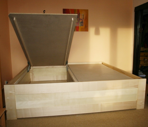 Zvýšená postel s velkým úložným prostorem v provedení masivní javor pro zákazníka z Havířova. Přístup do úložného prostoru je zajištěn díky výklopu roštu s matrací.