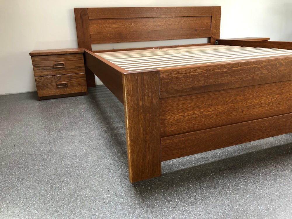 Dubová postel Ostrava - Postel z masivu byla vyrobena na míru pro zákazníka z Ostravy. Zákazník měl při zadání zakázky  specifické požadavky na tvar a barvu postele tak aby byla v souladu se stávajícím vybavením ložnice, vše bylo dokončeno v termínu a k plné spokojenosti zákazníka.