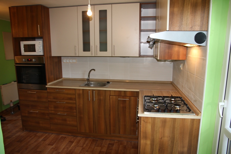 Kuchyň je vyrobena z kvalitního laminovaného materiálu - ořech a vanilka. Jde o rohovou kuchyň. Kuchyň se montovala ve Studénce u Nového Jičína.