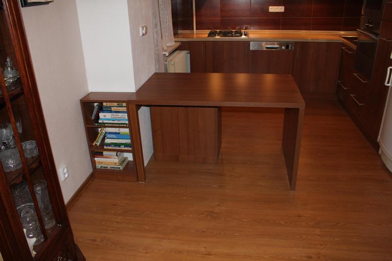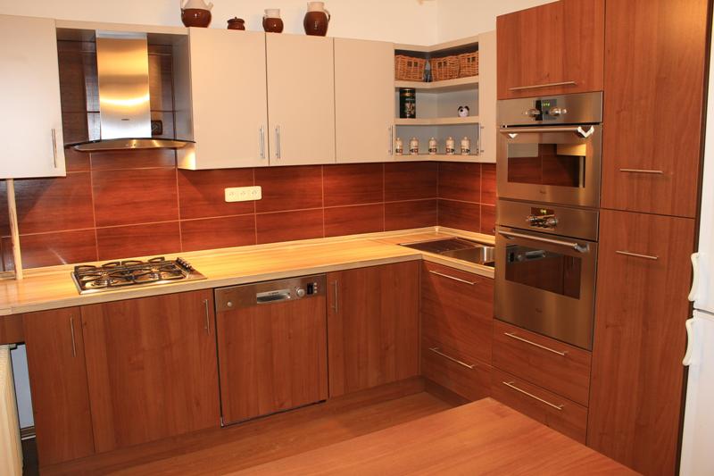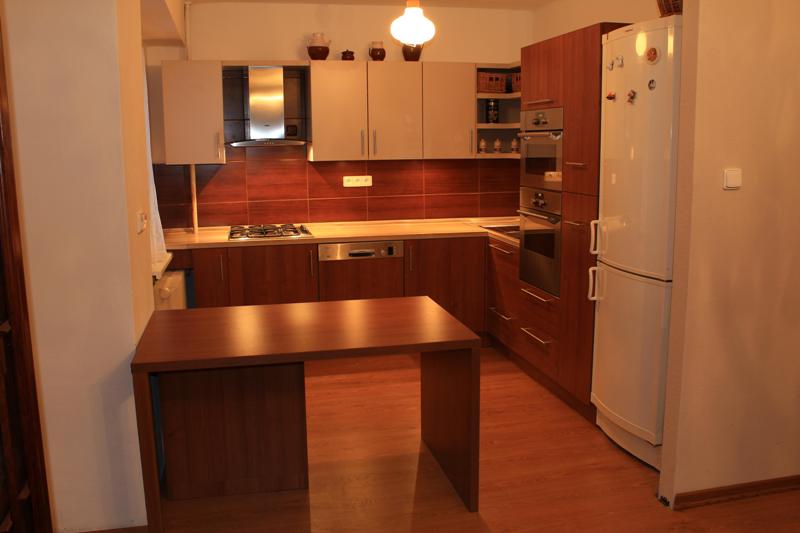 Kuchyň je vyrobena z kvalitního laminovaného materiálu - ořech a písek. Jde o rohovou kuchyň se stolem.