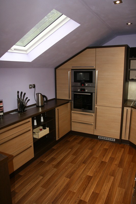 Kuchyň je vyrobena z kvalitního laminovaného materiálu - skořice a ořech. Jde o rohovou kuchyň s barem.